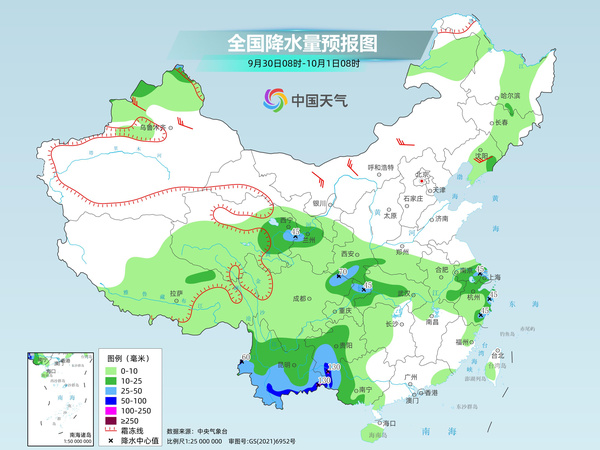 今天,台风影响趋于结束,华南、西南等地雨势明显减弱,广西西部、贵州西南部、云南中南部部分地区有大到暴雨,云南东南部、广西西部等地局地有大暴雨。明天是国庆中秋假期首日,我国降雨将再发展增多,华西至黄淮地区局地有大暴雨。
