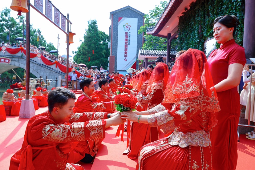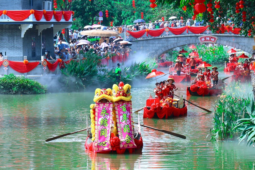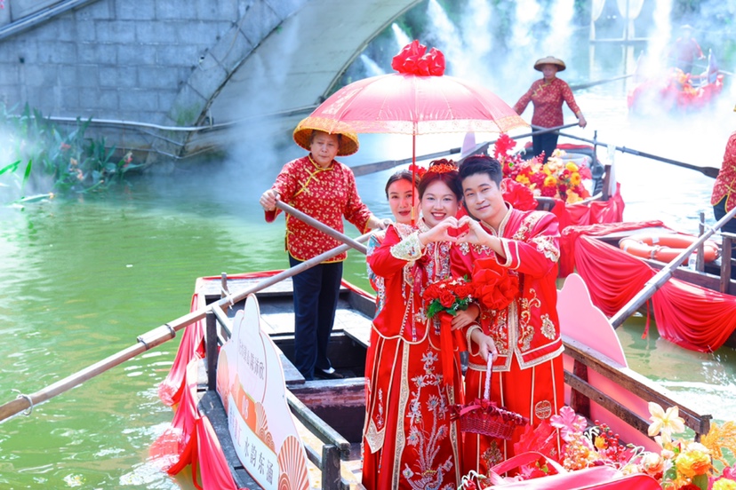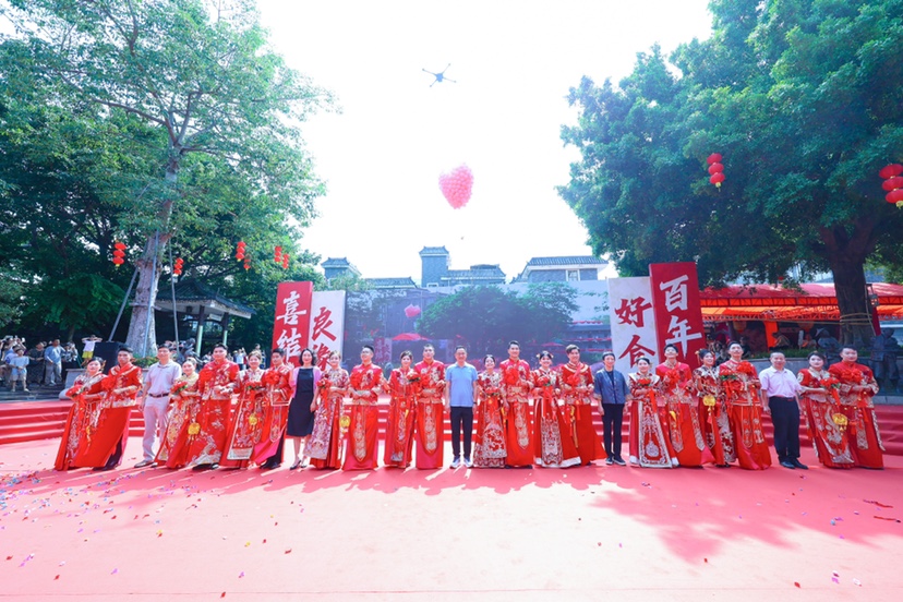 与国同庆,鸾凤和鸣。10月1日,“拾年囍汇,水韵东涌”2025广州南沙区东涌镇第七届水乡集体婚礼在“东涌里”隆重举办。水道两岸张灯结彩,喜庆氛围满溢,水上花艇迎亲、非遗婚俗仪式、无人机洒气球……吸引了众多市民和游客前来观看。