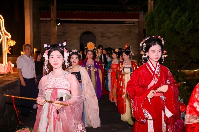 仪式结束后,数十位汉服爱好者手提鱼灯从留耕堂出发,围绕古镇开展迎月提灯巡游,点亮沙湾夜色,将活动推向高潮。
