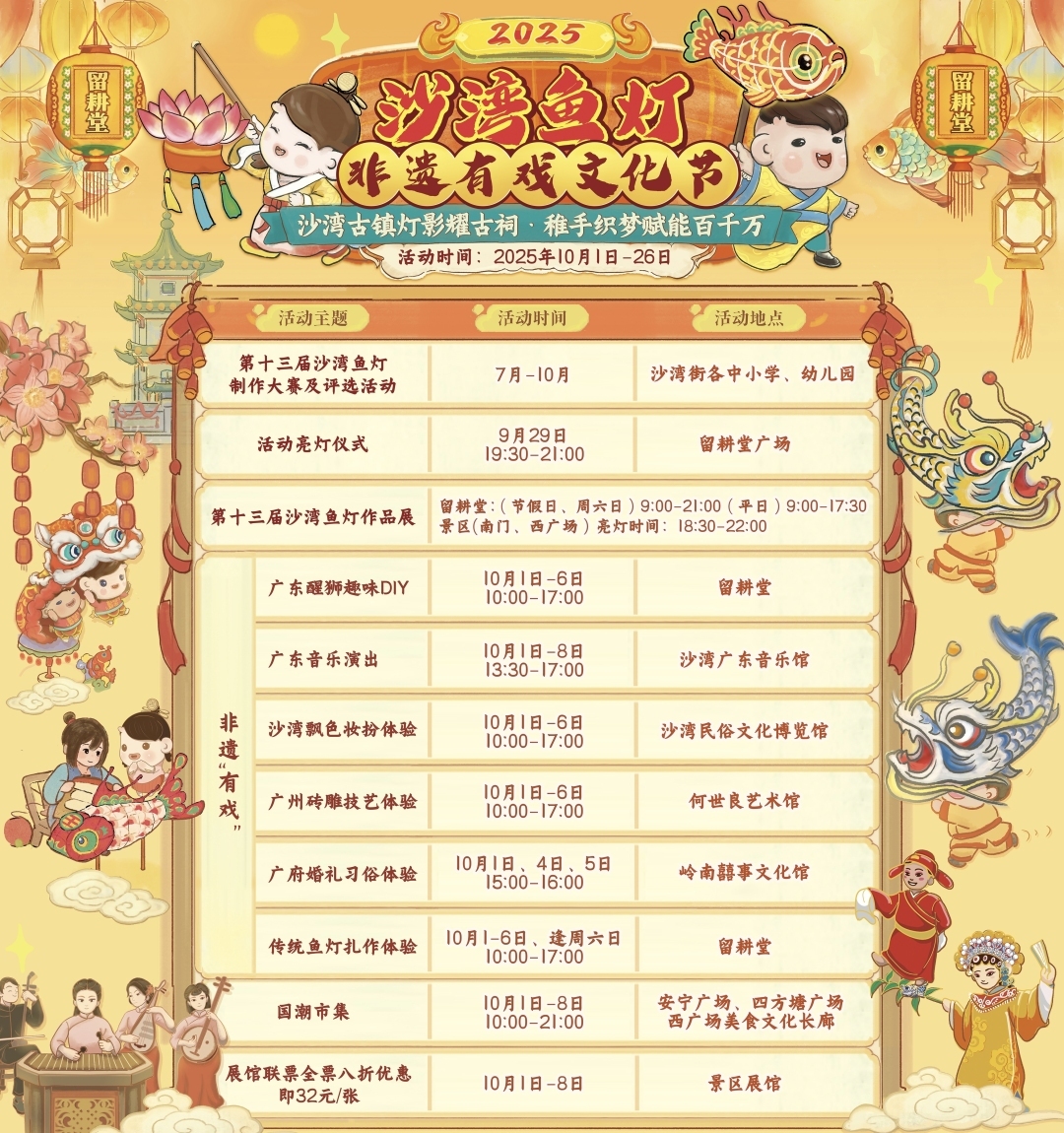 国庆中秋假期期间,沙湾古镇还推出七大非遗“有戏”体验活动,包括广东醒狮DIY、广东音乐演出、沙湾飘色妆扮、广州砖雕技艺体验、广府婚礼习俗体验、传统鱼灯扎作及国潮市集,时间贯穿整个假期,覆盖多个场馆。此外,古镇展馆联票国庆期间实行八折优惠,助力游客深度体验沙湾文化。