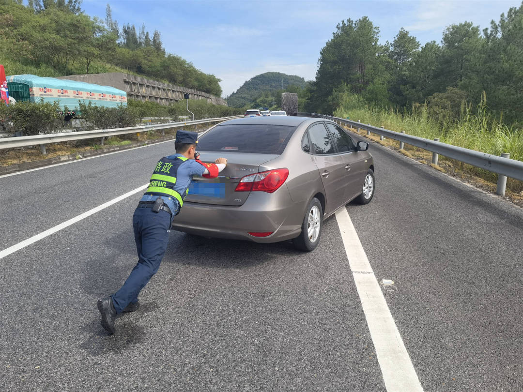征得交警同意后,一组人员临时封闭交通,另一组协助司机将车辆推至应急车道安全区域,并引导司乘到护栏外等待救援。10分钟后,司乘人员和故障车被救援车辆安全转移。
