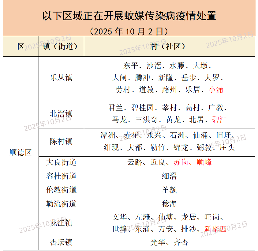 10月2日晚,“顺德疾控”微信公众号发布当天正在开展蚊媒传染病疫情处置的区域。据了解,新增区域包括乐从、北滘、大良、龙江等镇街的5个村居,请市民游客注意做好防蚊工作。