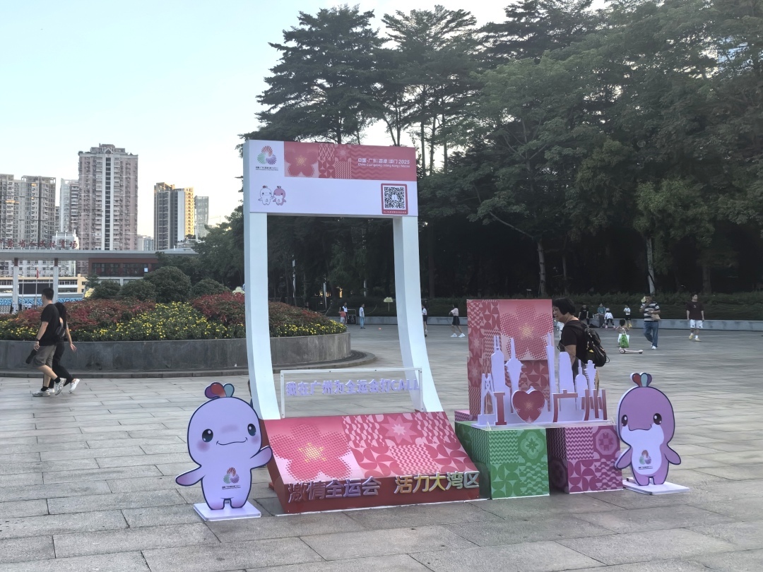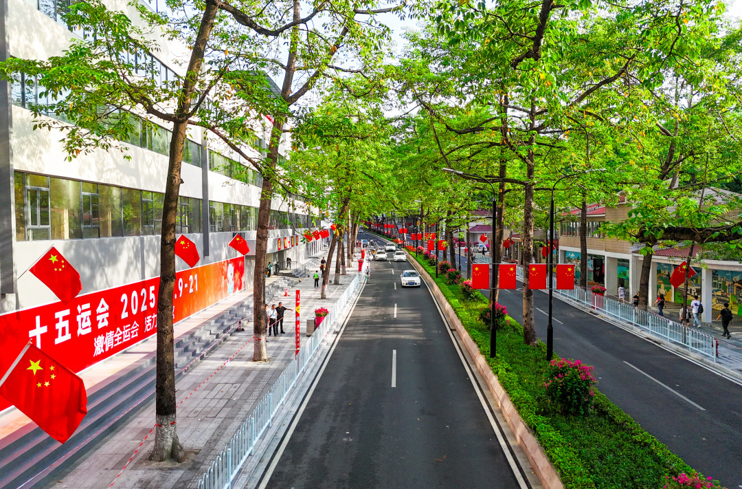 国庆假期,记者在广州市越秀区看到,在飘扬的五星红旗下,主要商圈和路段十五运和残特奥会氛围热烈。