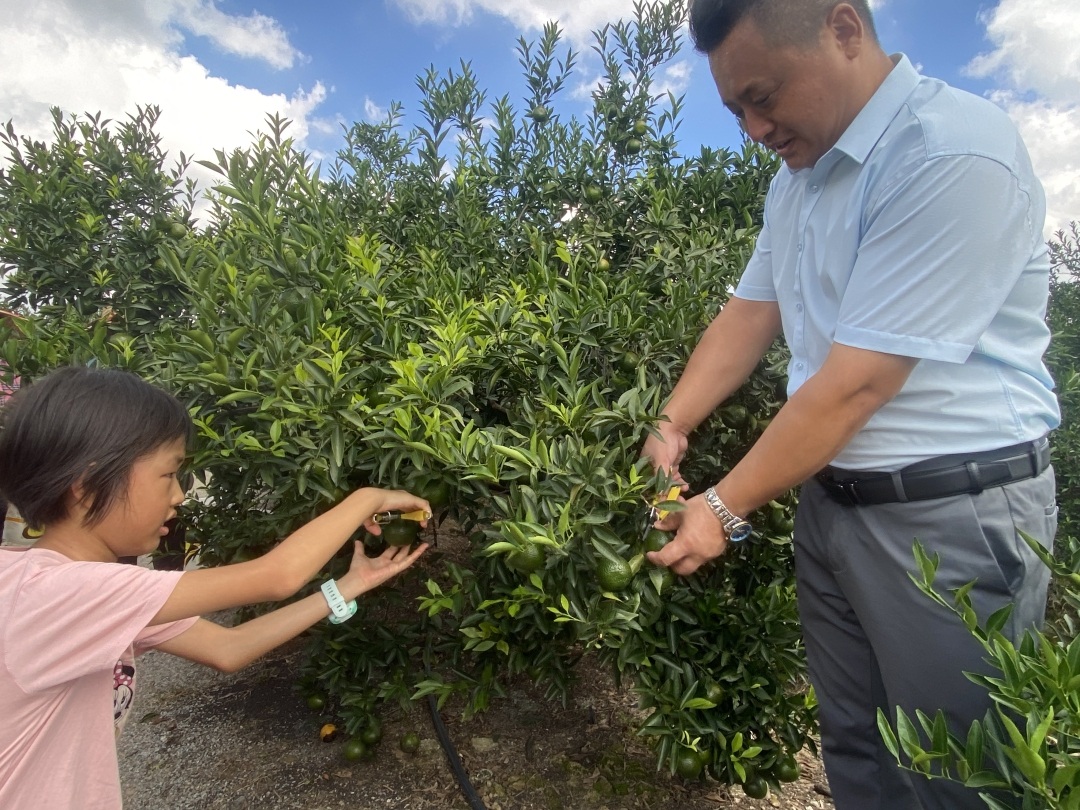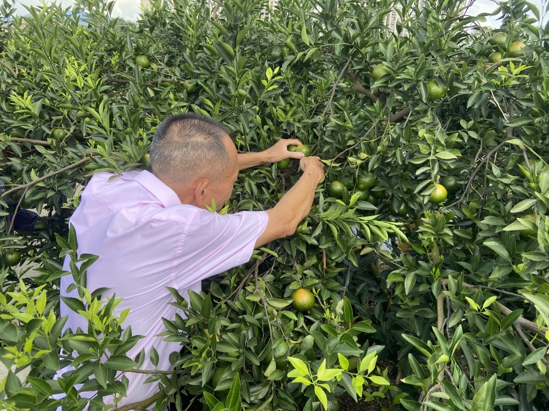 记者在柑园看到,柑园内柑树粗壮且枝叶繁茂,硕大的新会柑挂满枝头,新会柑青绿中带黄,外皮呈现出一种独特的光泽,闪闪发亮;同时还有许多微小的凹点,分布均匀,密集饱满。叶保雄介绍,这里位于新会梅江村生态优良的柑种植基地,种植环节实现了全方位规范化升级:摒弃传统种植中依赖化学农药的粗放模式,推广生物防治技术——悬挂诱虫板、释放捕食螨,以自然之力抵御病虫害;建立农资使用台账制度,从肥料选购到农药喷施,每一步都有记录可查,杜绝有害物质流入田间。