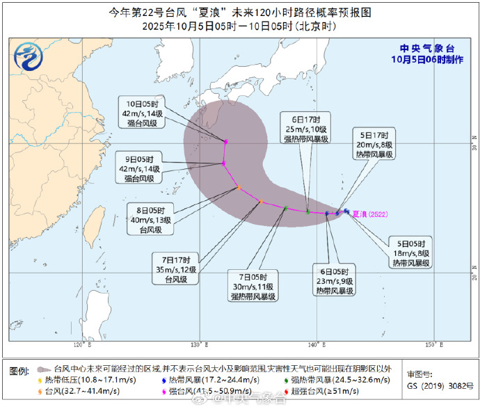 今年第22号台风“夏浪”(热带风暴级;英文名称:Halong;名字来源:越南;意义:越南一海湾名)已于今天(5日)凌晨在西北太平洋洋面上生成,早晨5点钟其中心位于日本九州岛东南方向约1430公里的西北太平洋洋面上,就是北纬24.8度、东经142.6度,中心附近最大风力有8级(18米/秒),中心最低气压为998百帕,七级风圈半径100-200公里。预计,“夏浪”将以每小时5-10公里的速度向西偏南方向缓慢移动,强度逐渐加强。