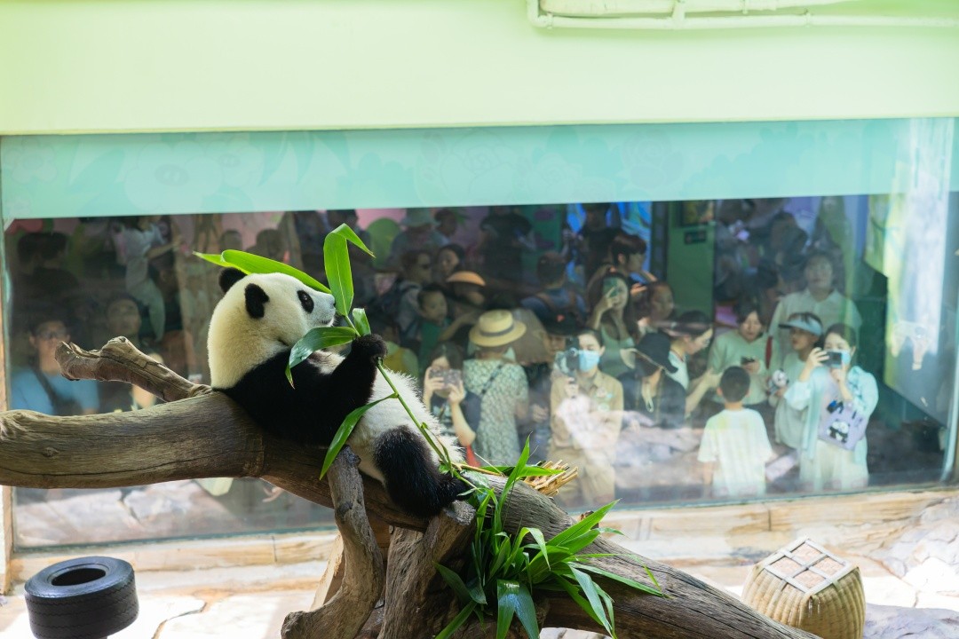 节日期间,动物朋友们也过上了热闹的双节。10月1日,黑猩猩、长鼻猴、亚洲象、巴西貘、长颈鹿等动物,纷纷享用起特制的水果蛋糕与水果月饼,以此庆贺国庆与中秋。10月6日,园区还将为红毛猩猩“红毛丹”举办百日庆祝活动。值得一提的是,2025年9月30日,大熊猫“国庆”迎来了 6 周岁生日,这只2019年出生、因恰逢新中国70周年华诞而得名的熊猫,如今在长隆野生动物世界里活力满满。游客可以看到它头顶标志性的“呆毛”和进食时竖起来的“牛角耳”,可爱的大熊猫“国庆”成为假期里当之无愧的热门打卡“明星”。