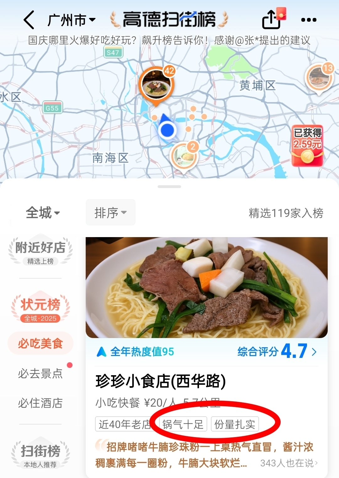 国庆中秋双节期间,广州西华路的珍珍美食店,连续多日迎来从高德扫街榜“按图索店”的排队食客。高德扫街榜老字号榜单显示,该店的收藏量,在老字号类目中名列广州第一。