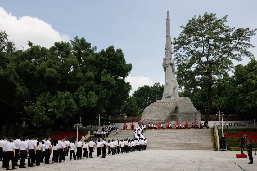 当日上午,位于越秀区的广州起义烈士陵园内,松柏苍翠,纪念碑巍然耸立,广东省、广州市党政军群各界代表约500人一起向广州起义纪念碑敬献花篮,赓续英烈精神、汲取奋进力量。