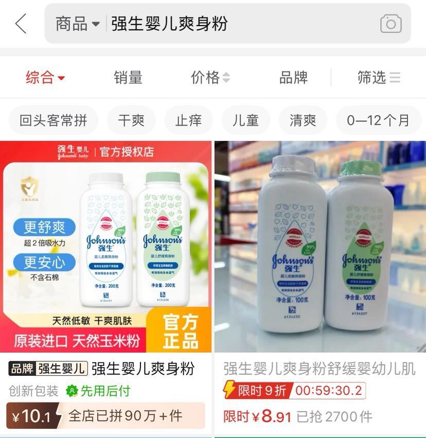 记者在平台搜索关键词“强生婴儿爽身粉”发现,在售产品相关介绍语纷纷标注强调了“天然玉米粉”“不含石棉”等信息。