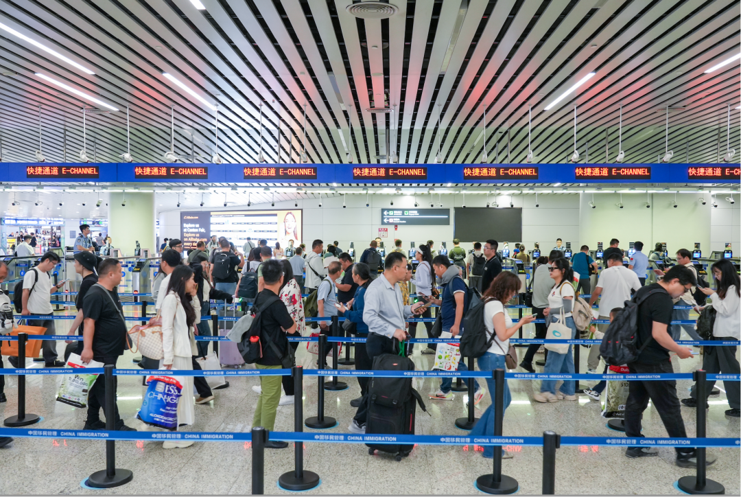 记者10月8日从广州出入境边防检查总站获悉,今年国庆假期(10月1日0时至10月8日12时)期间,经该总站下辖口岸出入境人员超37.4万人次,较去年同期增长约12%。其中,白云国际机场口岸出入境人员达35万人次,日均客流突破4.6万人次;南沙港客运码头、东莞虎门客运码头、琶洲港澳客运码头等水运口岸出入境人员达2.4万人次。