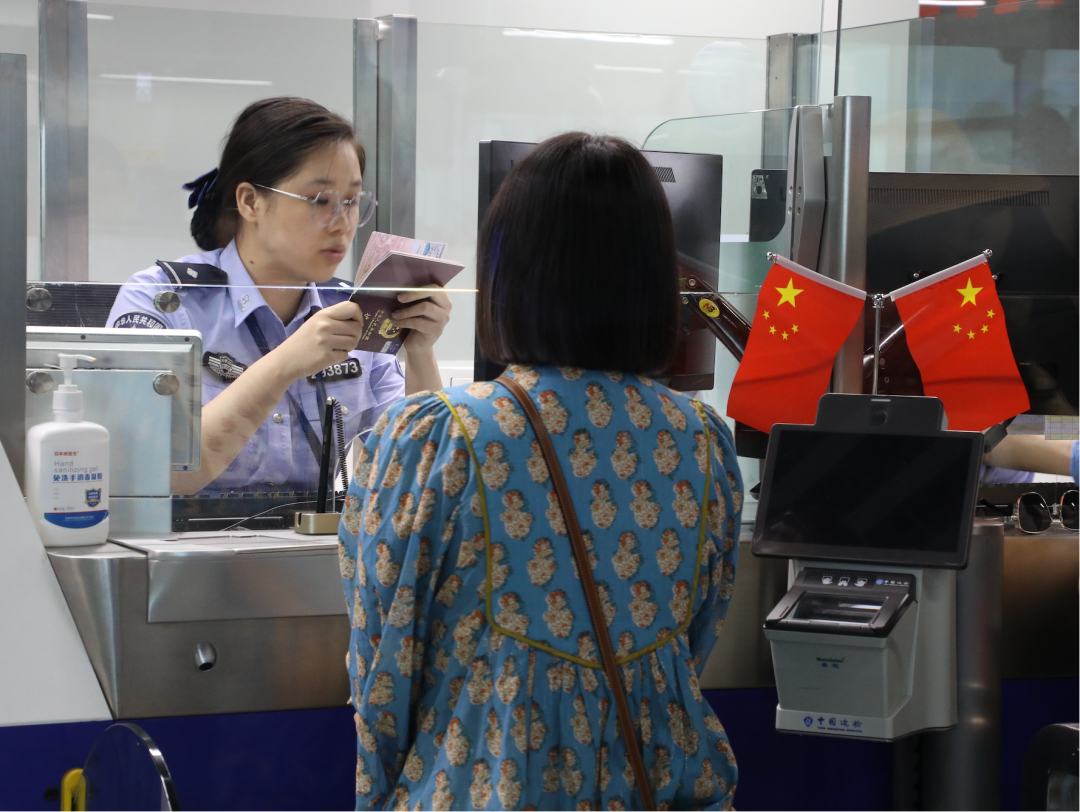 国庆期间,洲头嘴边检站移民管理警察在查验出入境旅客