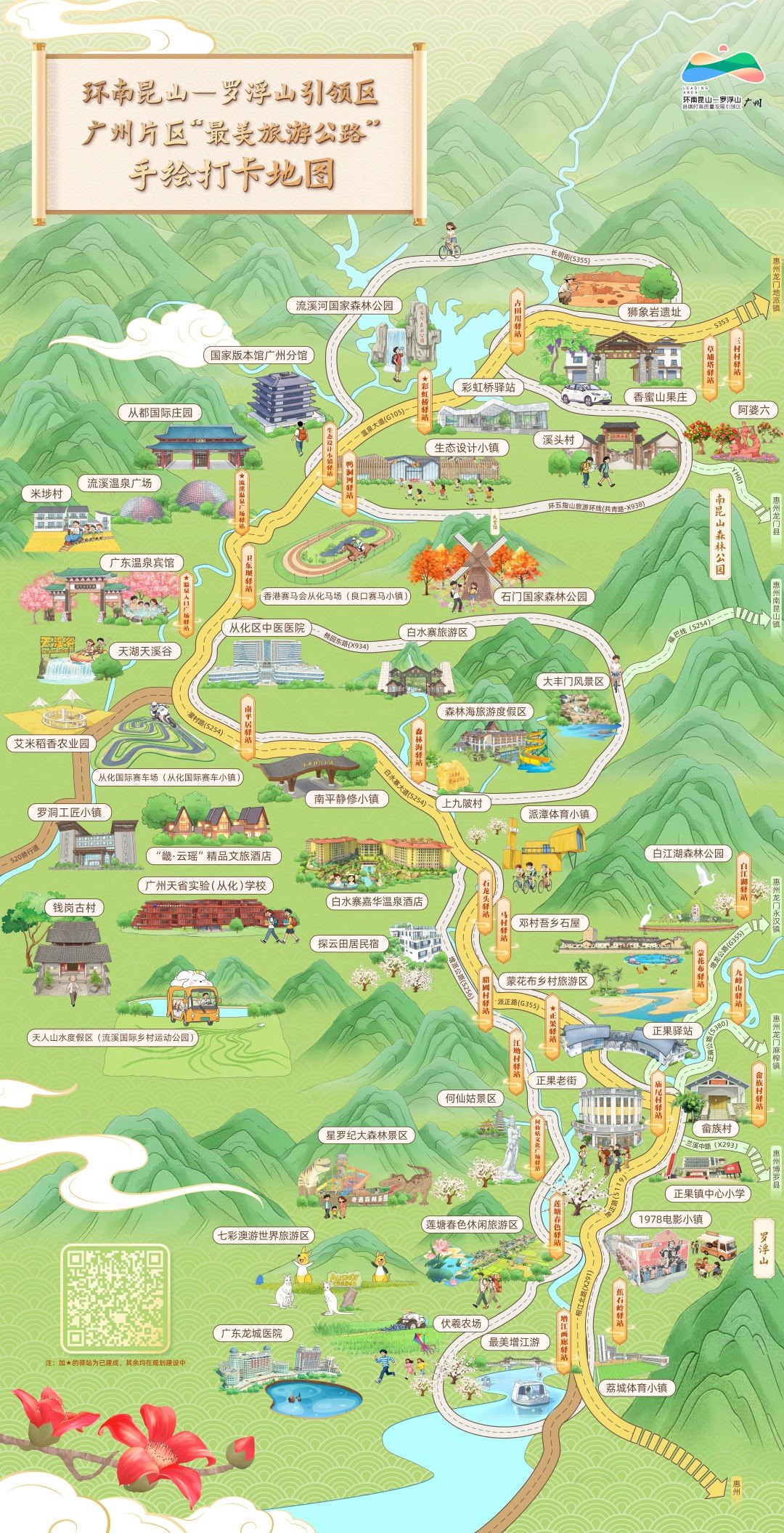 这个国庆假期,环南昆山—罗浮山县镇村高质量发展引领区(以下简称为“引领区”)广州片区“最美旅游公路”手绘打卡地图正式发布——这不仅是假期country walk的旅游指南,更是观察广州纵深推进“百千万工程”、破解区域发展不平衡难题的绝佳窗口。