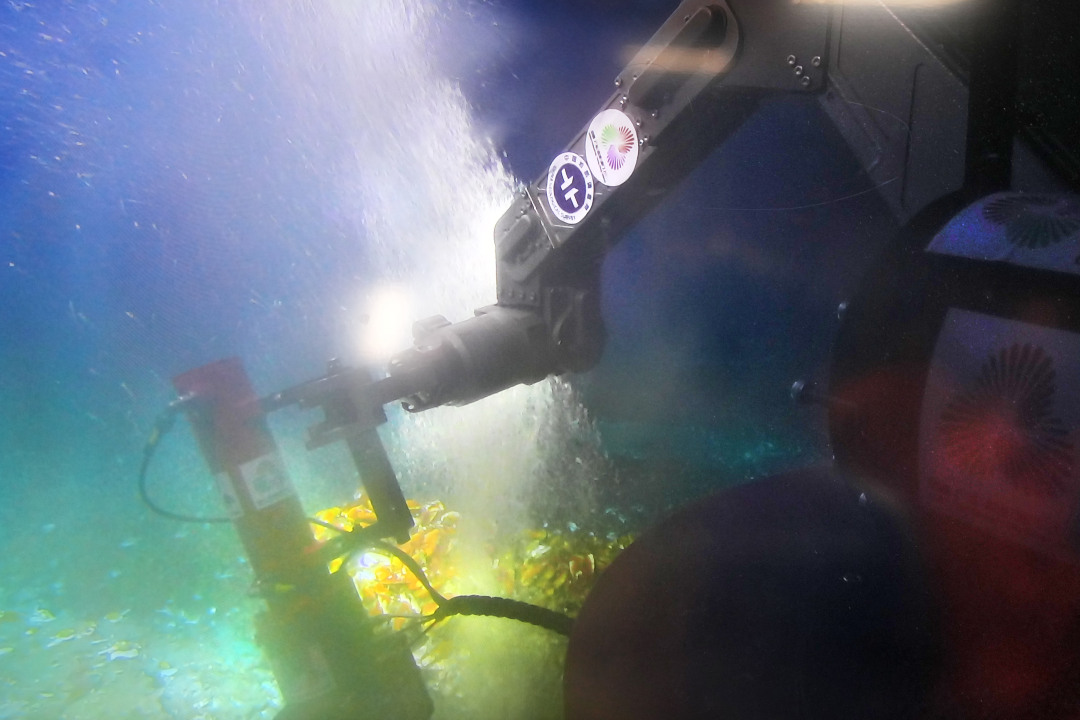 科研人员远程精准操控机械臂持采集舱,采集渗漏点溢出的可燃冰及伴生气。