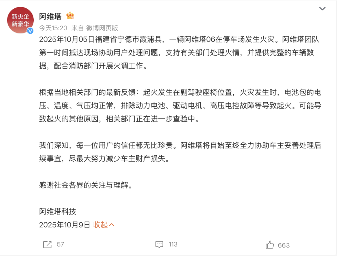 阿维塔表示,“阿维塔团队第一时间抵达现场协助用户处理问题,支持有关部门处理火情,并提供完整的车辆数据,配合消防部门开展火调工作。”