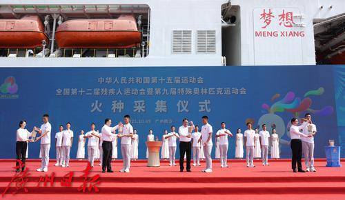 在“梦想”号大洋钻探船的见证下,第十五届全国运动会和全国第十二届残疾人运动会暨第九届特殊奥林匹克运动会火种采集仪式在广州南沙举行。