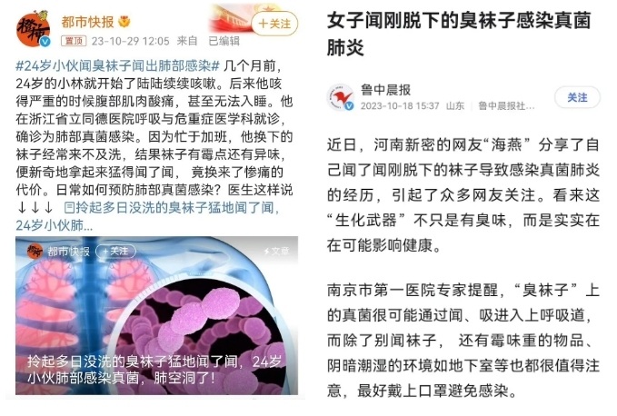 比如近年来媒体报道的“因为闻了臭袜子而肺部感染”的案例——