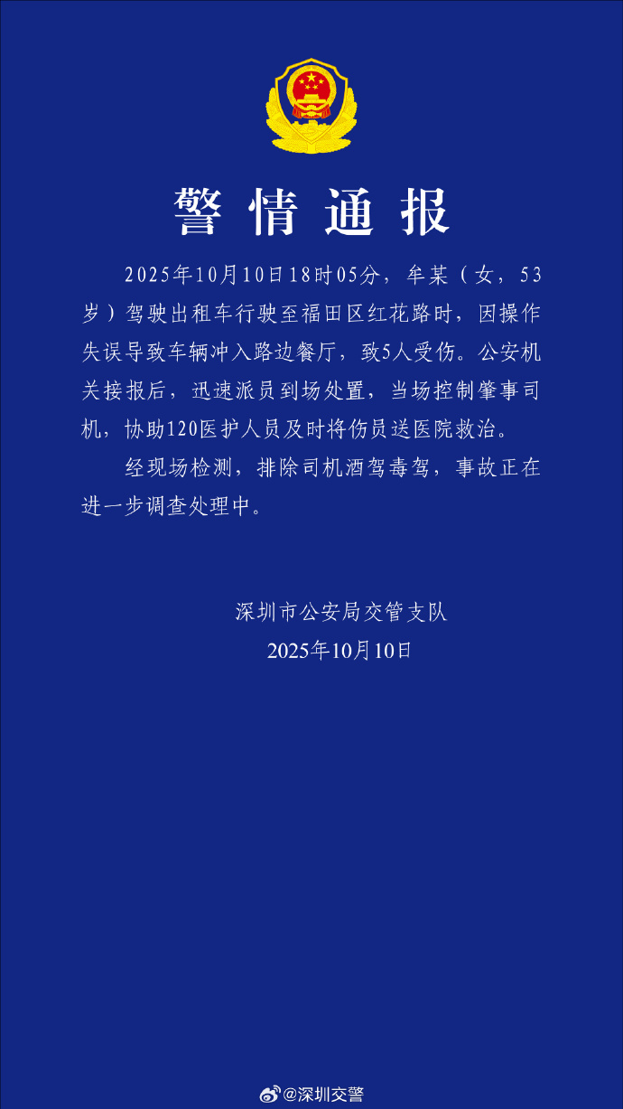 10月10日18时05分,牟某(女,53岁)驾驶出租车行驶至福田区红花路时,因操作失误导致车辆冲入路边餐厅,致5人受伤。公安机关接报后,迅速派员到场处置,当场控制肇事司机,协助120医护人员及时将伤员送医院救治。