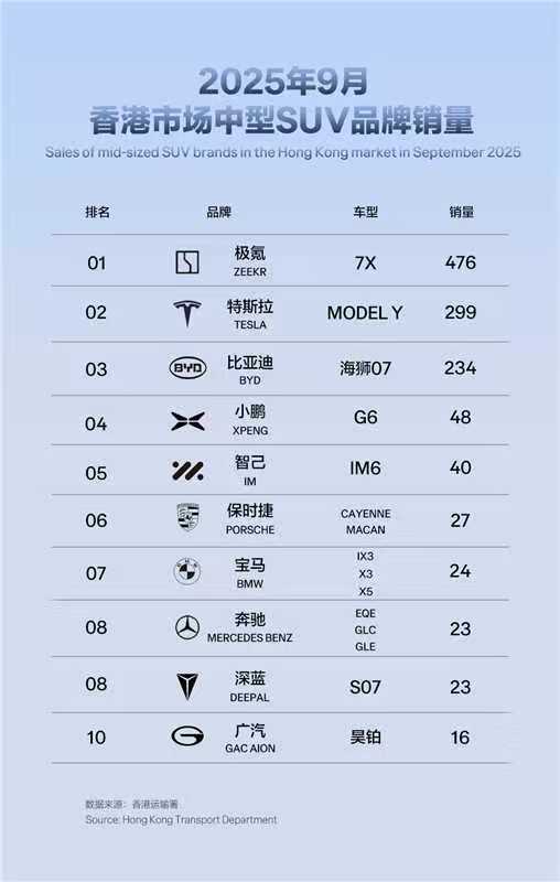 近日,香港运输署公开数据显示,今年9月,极氪旗下豪华大五座SUV极氪7X在香港市场交付首月即力压特斯拉Model Y,夺得当地中型SUV销量冠军,展现出强劲的全球化产品竞争力。