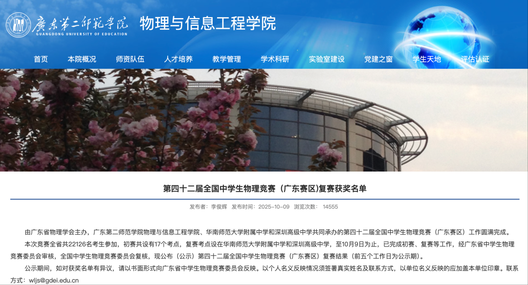 10月9日,广东第二师范学院物理与信息工程学院官网发布第42届全国中学生物理竞赛(广东赛区)复赛获奖名单。官网信息显示,由广东省物理学会主办,广东第二师范学院物理与信息工程学院、华南师范大学附属中学和深圳高级中学共同承办的第42届全国中学生物理竞赛(广东赛区)已完成初赛、复赛等工作。本次竞赛全省共有22126名考生参加,共计860人获奖。名单显示,共计121人获一等奖,286人获二等奖,453人获三等奖。
