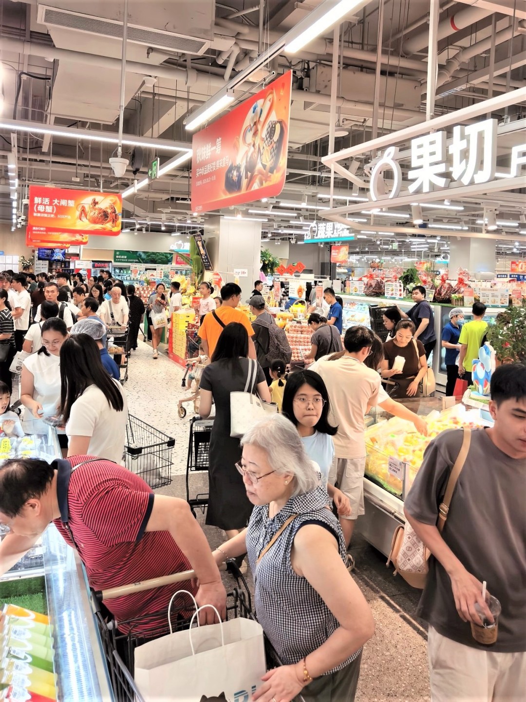 数据显示,双节期间东莞、中山、珠海的帝王蟹消费需求增速迅猛。其他热门的水产品,包括大闸蟹、三文鱼、九节虾等,莞中珠三家店的销量,同样相当于广东店均的3倍。这些门店在“双节”期间迎来客流高峰,部分门店甚至因顾客过多出现“盒马堵”现象,反映出各地居民对高品质商品与便捷消费的强烈需求。