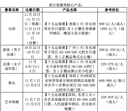 广之旅副总裁文爽介绍,更新后的全运观赛类旅游产品覆盖更为丰富的热门赛事项目,结合广州、佛山、江门、深圳、珠海、云浮、香港、澳门等多个全运会举办城市,推出观赛团和“观赛门票+酒店住宿、景点门票、餐券”组合套餐类产品。