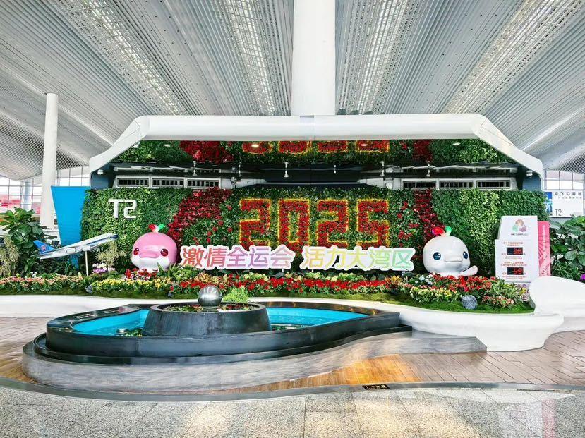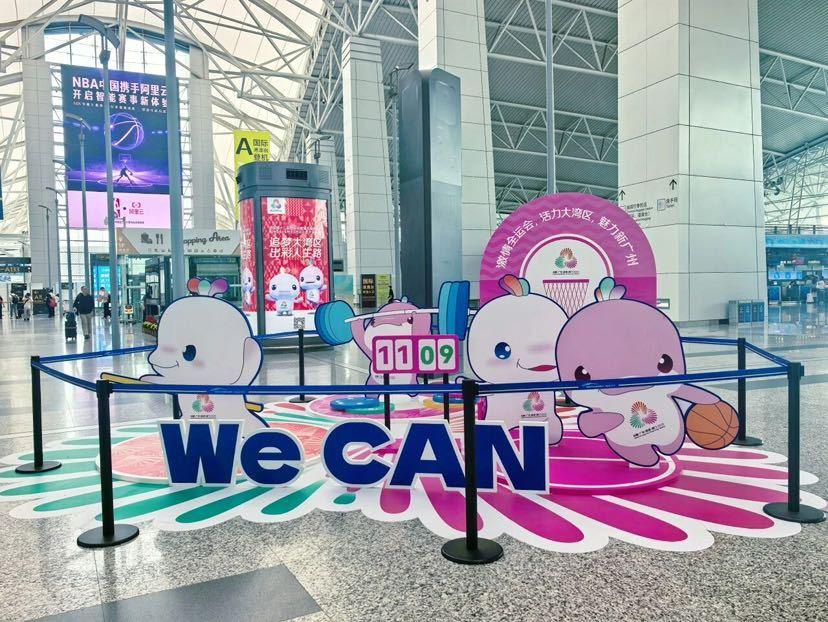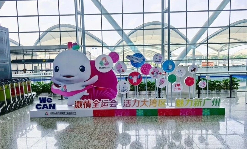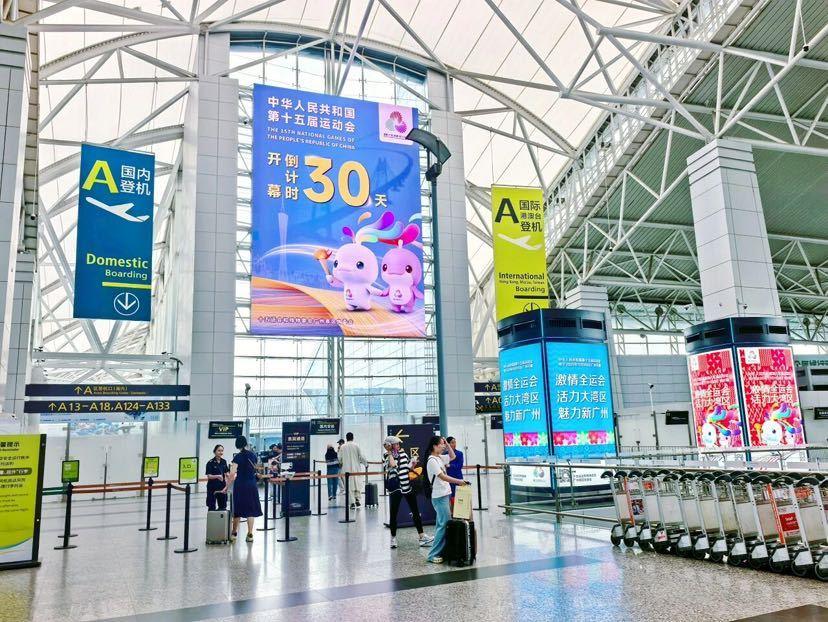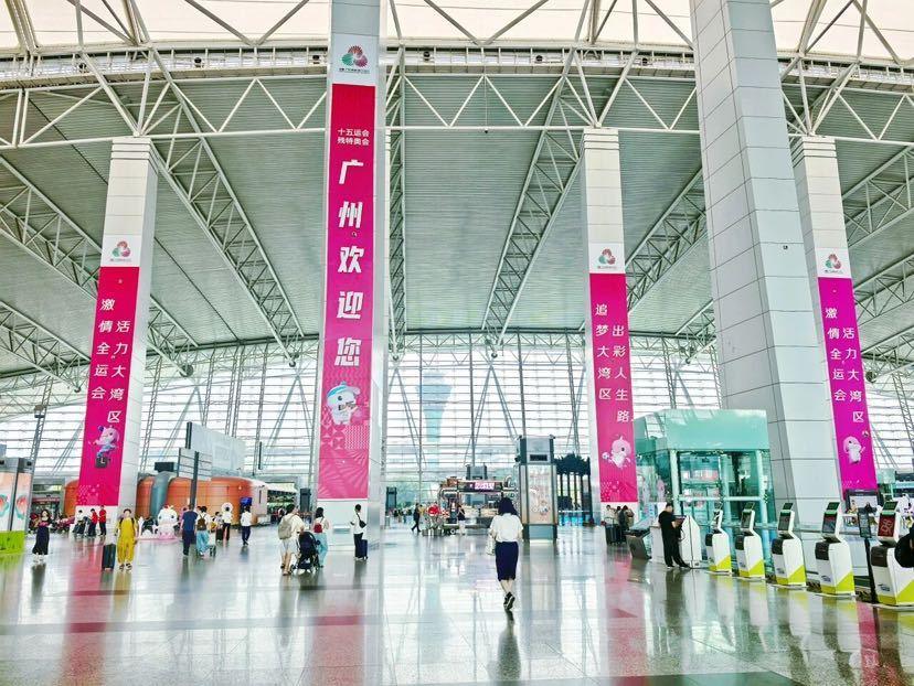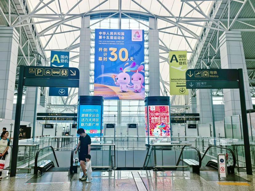 11月9日,首次由粤港澳三地共同承办的全国运动会 ——第十五届全运会将正式开幕,近日广州白云机场T1、T2航站楼内外,全运会氛围浓厚。