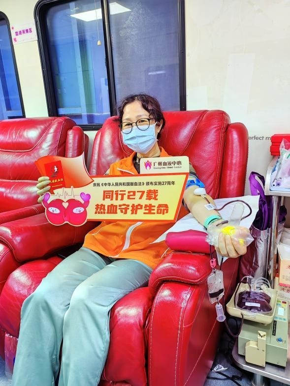 10月4日,在黄埔大沙地献血屋,包玉琴阿姨一边做志愿服务,一边完成了自己年满60周岁后的“最后一次献血”,累计献血量已达8000毫升。包玉琴阿姨自豪地说:“可以申请‘全国无偿献血奉献奖金奖’啦!能靠自己的血液救几个人,值了!”