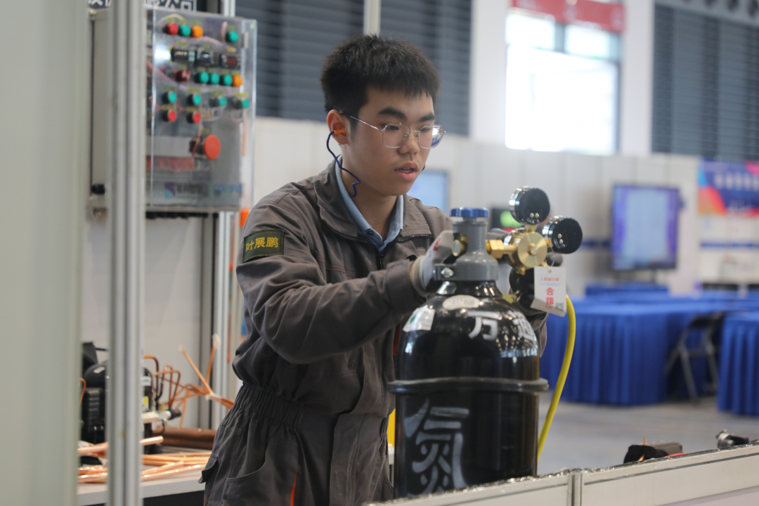 广州市工贸技师学院选手叶展鹏在第三届国赛制冷与空调项目比赛现场