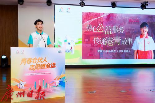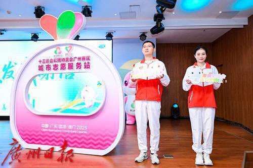 10月11日,十五运会和残特奥会广州志愿者授旗仪式在市团校举行,近300名“小海豚”代表宣誓上岗。赛会广州赛区已录取志愿者约1.4万人,将分布132个城市志愿服务站——105个新建升级站融合“紫荆紫+芽状”造型,27个共建站嵌入商圈、社区、场馆,统一提供问询、应急、文旅服务。现场发布升级版“广州志愿礼赞”:手抚心房、前伸点赞,两秒内完成文明礼仪;