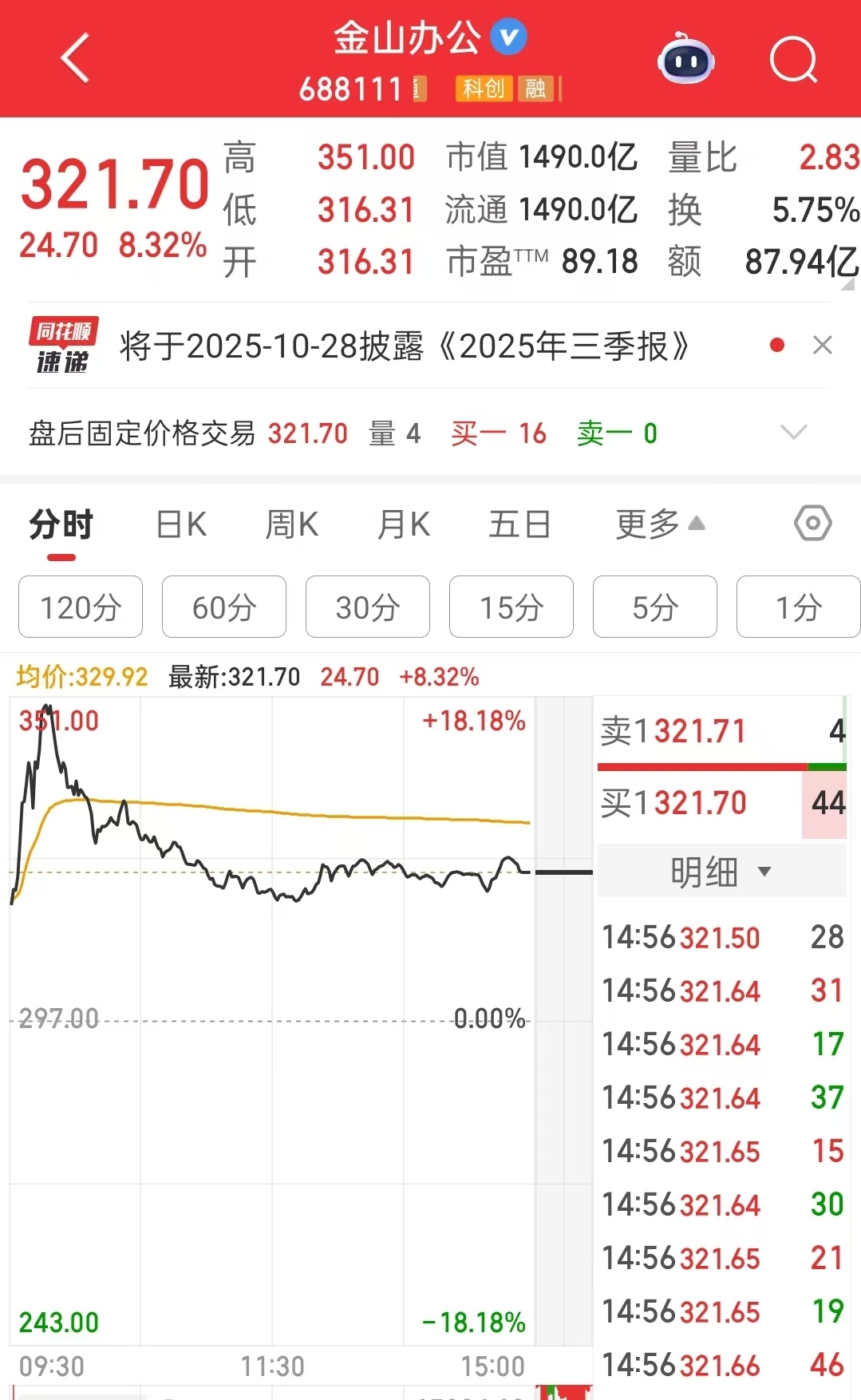 A股金山办公盘中也涨超18%,截至收盘,涨8.32%,报321.70元/股。