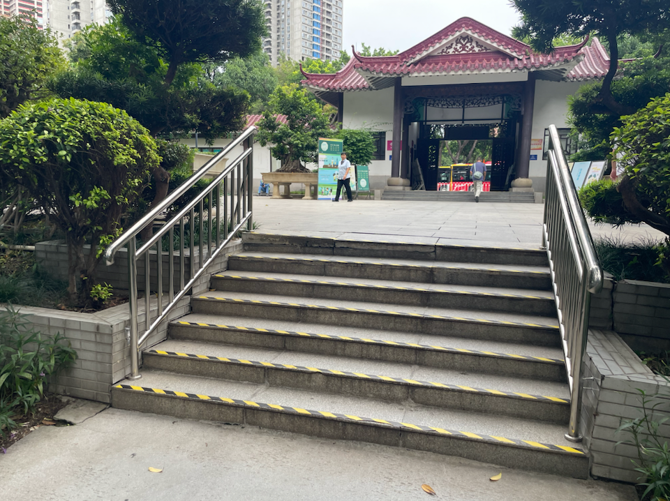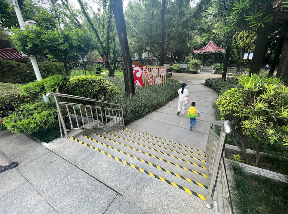 此外,公园更换了东门原有变形、破损的指示牌,使导引标识更加清晰,方便游客快速获取方位信息。东门卫生间排水管线也完成了疏通和改造,解决了因树根生长导致的堵塞问题,如厕环境更加舒适顺畅。同时,台阶还增加了黄黑相间的警示线,进一步方便老人家更好区分阶梯的距离,提升行人上落安全感。