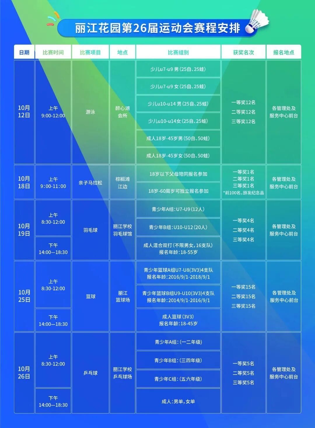 本次运动会设游泳、篮球、羽毛球、乒乓球等四个正式比赛项目及亲子障碍趣味马拉松,总共报名参赛运动员280人次,赛程安排为10月12日~26日,各项比赛的精彩瞬间均有专门的链接供业主实时查看和提取。