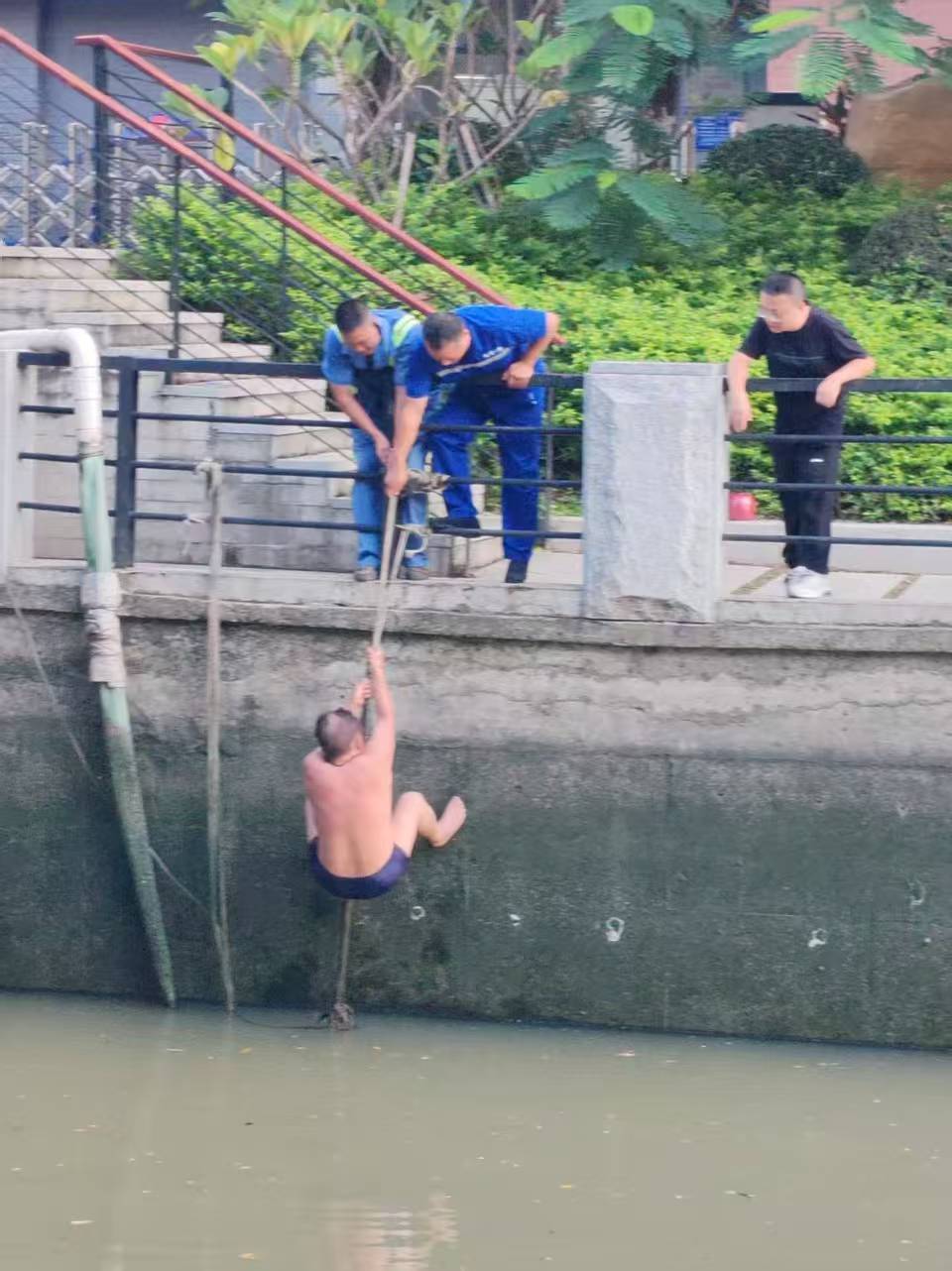 很快,环卫工人运来救援梯子,水务工作人员也携带救生工具先后抵达现场。众人迅速制定救援方案。由水务人员将梯子稳稳架在河岸与落水者之间,环卫工人在旁辅助稳固,潘仲灵则在岸边指导落水群众从梯子爬到岸上。经过几分钟的协同配合,落水群众成功被救援到岸边。