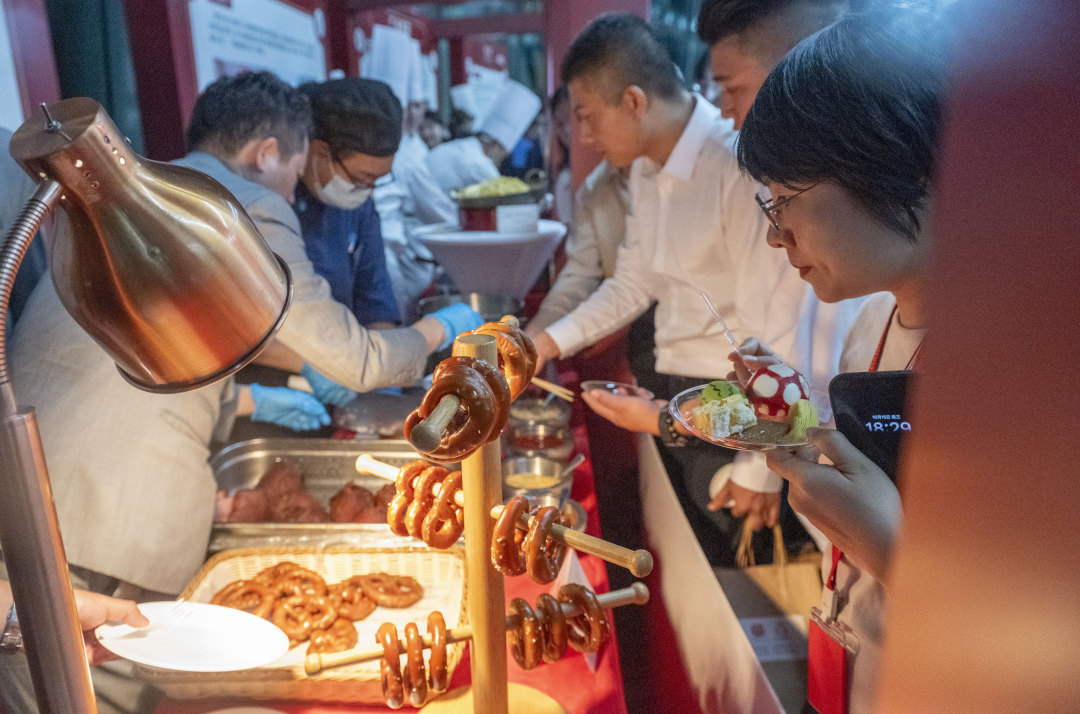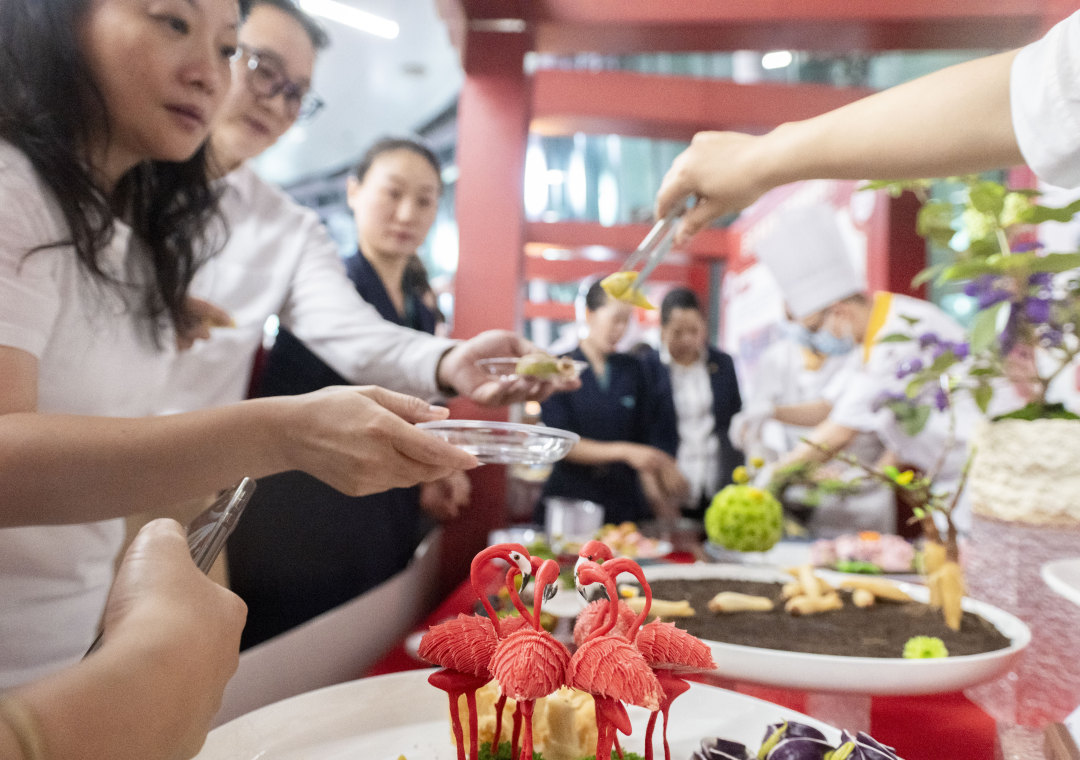 记者在现场了解到,多家星级餐厅推出与全运会相关的菜式。篮球样式的茶点、形似乒乓球的菜肴吸引许多嘉宾注意。“MVP灌篮包、蟹蟹乒乓球是我们结合时令食材,专门为全运会打造的产品,希望运动员们都取得好成绩!”广东点都德国际食品有限公司总经理沈志辉介绍称,餐厅从三星升为五星,内部管理上得到很大提升,也做好迎接八方客的准备。