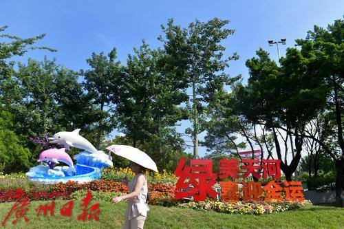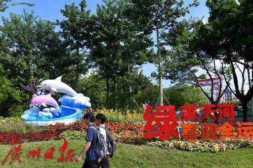 天河区奥体路路口的绿化带上布置了全运会主题的装置。