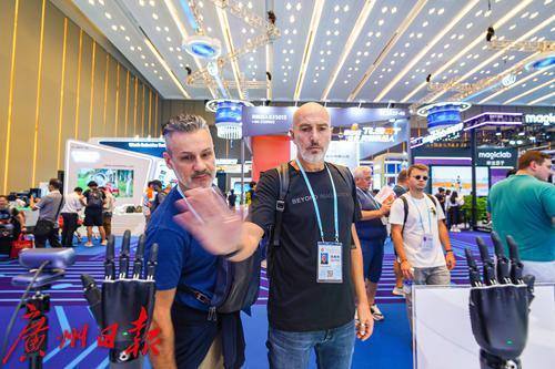 采购商一边拍摄一边用手势操作灵巧仿生手。
