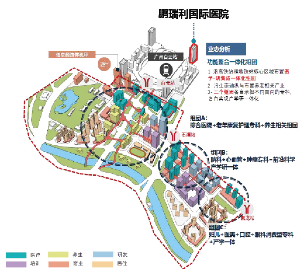 投资百亿元的鹏瑞利国际医养城项目落地白云,该项目首期“白云鹏瑞利国际医院”已落户广州白云站TOD粤胜广场东南塔