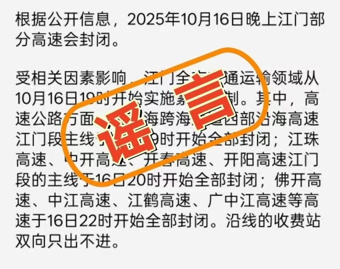 经核实,该信息为虚假信息,目前江门市辖区内所有高速公路均正常通行,未采取封闭措施。