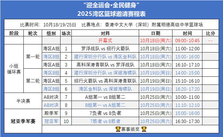 “迎全运会·全民健身”!在第十五届全国运动会和全国第十二届残疾人运动会暨第九届特殊奥林匹克运动会(以下简称“十五运会”)进入倒计时1个月的日子里,10月18日,由广东高科技产业商会、广州日报报业集团(广州日报社)主办的“2025湾区篮球邀请赛”将在深圳市福田区香港中文大学(深圳)附属明德高级中学篮球场激情开赛!