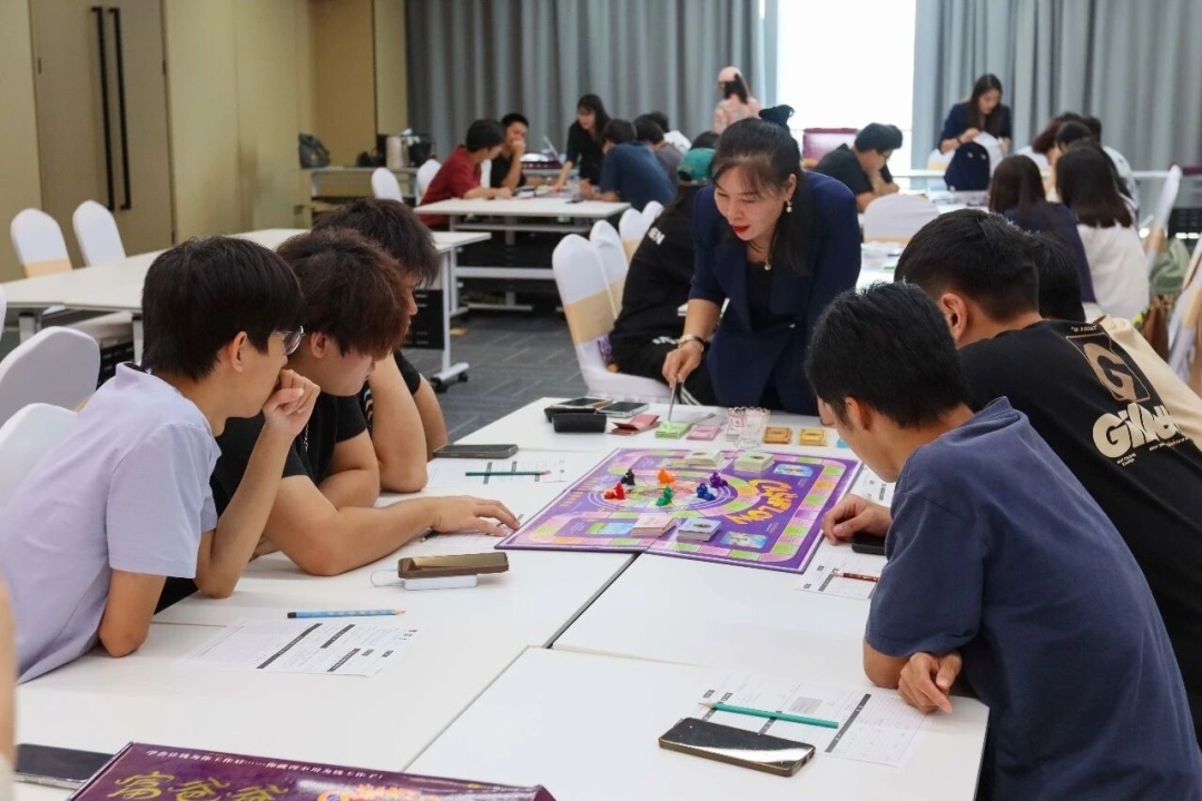 如果说参观让大家“眼见为实”,那么“人生40年”现金流沙盘活动则让学生们亲身体验人生角色的变换。53人分成8组开启“模拟人生”:从青年时期选职业、定方向,到中期规划家庭建设,再到长期积累财富,每一步都要结合金融市场变化做决策,帮助学生们理清职业方向。