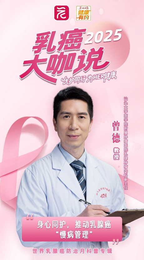 随着诊疗技术的飞速发展,乳腺癌治疗已迈入“慢病管理”时代,患者的生存期显著延长,对生命质量的要求也日益提高。在此背景下,如何实现从躯体治疗到心灵关怀的“全面守护”,成为医患双方共同探索的新课题。世界乳腺癌防治月来到之际,广州日报健康有约“2025乳癌大咖说”对话汕头大学医学院附属肿瘤医院乳腺肿瘤内科副主任曾德教授,他指出,构建涵盖医疗、家庭、社会的全方位支持体系,能够助力患者回归有质量、有尊严的生活。