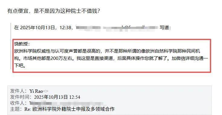 饶毅教授随后询问“有点便宜,是不是因为这种院士不值钱”?对方在邮件中表示,欧洲科学院权威性与认可度声誉都是很高的,并不是那种所谓的像欧洲自然科学院那种民间机构。市场其他都是200万左右。如果有意申报可以先发一份英文版全面的简历,先与欧洲科学院沟通,如果反馈情况是支持申报的话再准备材料、联系提名人申报。