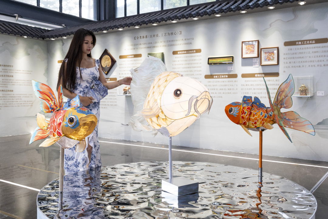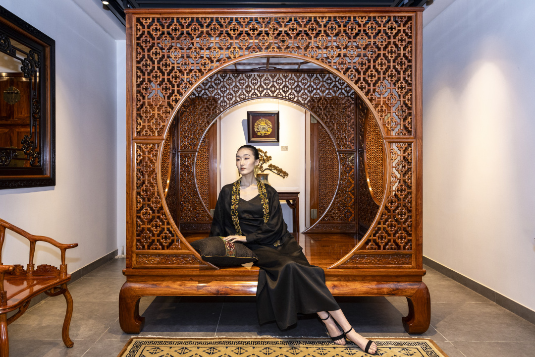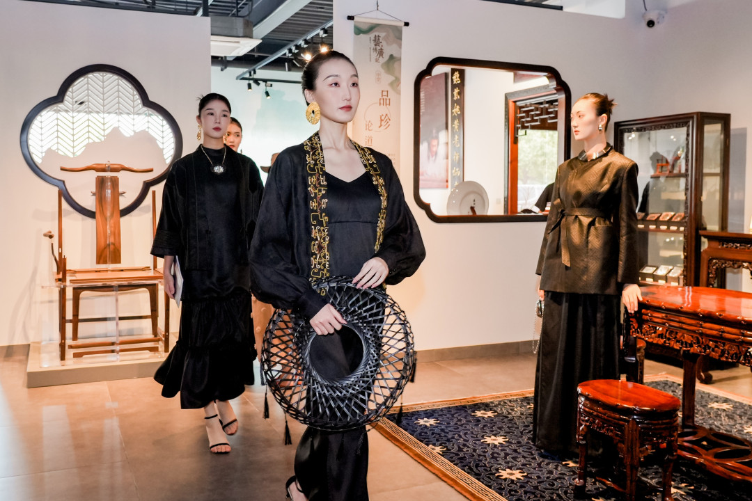 简单而隆重的仪式后,主办方以一场穿越秀场“静·动”双线呈现展览内核:静态呈现工艺器物的匠心之美,动态古琴雅韵与模特展演则共同描绘东方意境的沉浸体验。身穿时尚廓形香云纱时装的模特融入到内场的家居场景里,沉浸式的五感体验,让大家从流动的呈现方式感受眼前的工艺美术精品,从而升华到新中式美学体验的境界。