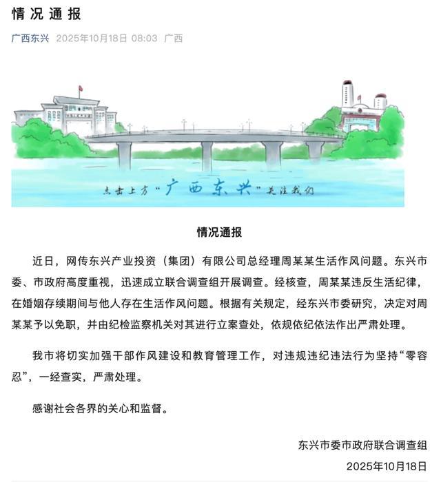 广西东兴市委市政府联合调查组10月18日发布情况通报:近日,网传东兴产业投资(集团)有限公司总经理周某某生活作风问题。东兴市委、市政府高度重视,迅速成立联合调查组开展调查。经核查,周某某违反生活纪律,在婚姻存续期间与他人存在生活作风问题。根据有关规定,经东兴市委研究,决定对周某某予以免职,并由纪检监察机关对其进行立案查处,依规依纪依法作出严肃处理。