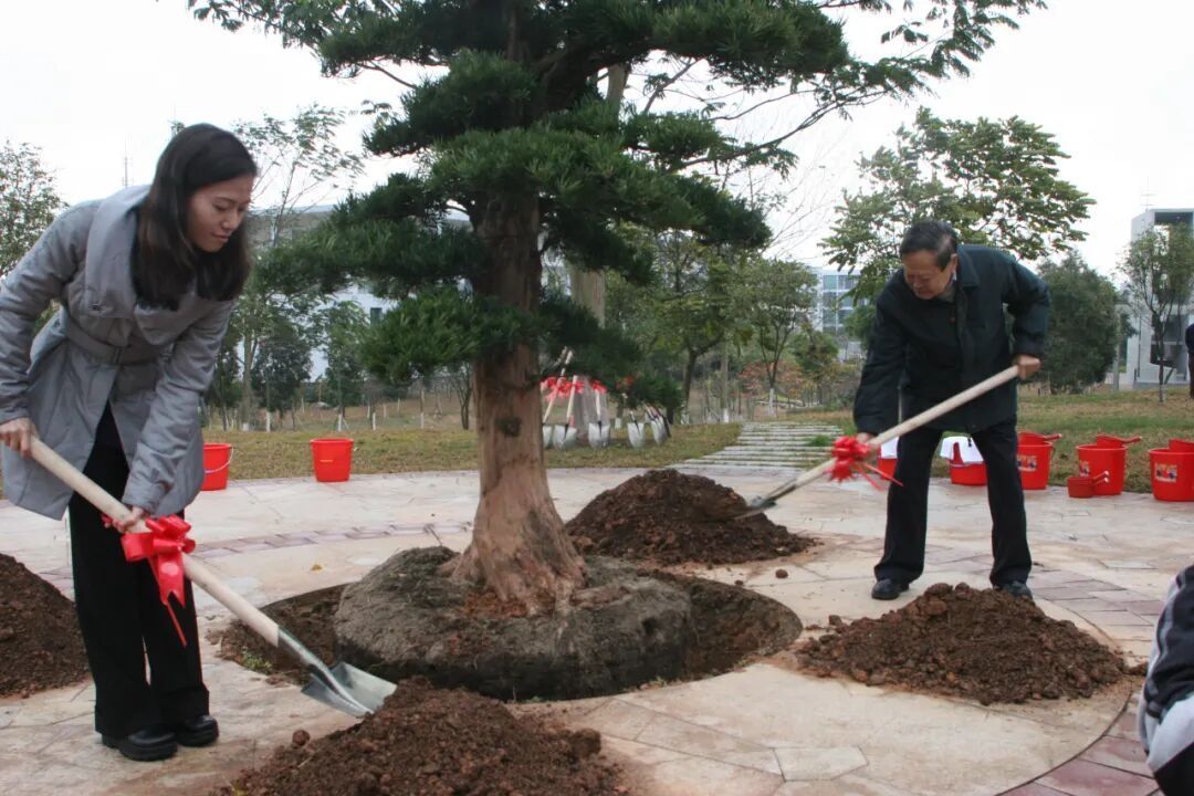杨振宁在罗汉松下与东莞理工学院学子合影