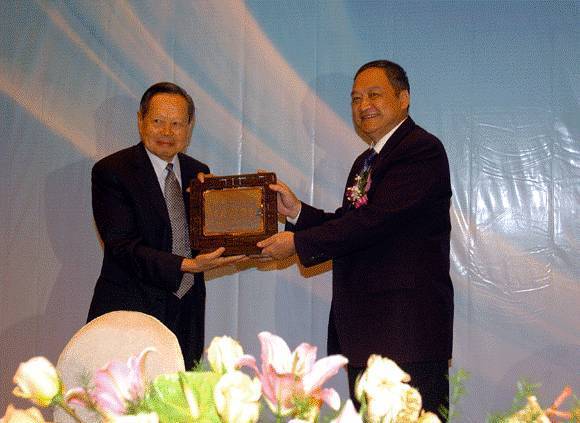 2007年捐赠仪式上,时任中山大学校长黄达人向基金会董事会名誉主席杨振宁教授赠送纪念品
