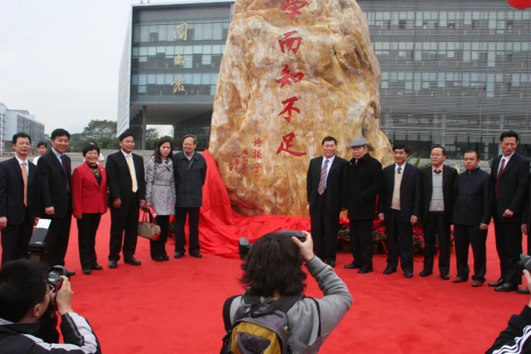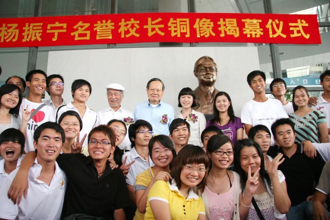 杨振宁先生在铜像前与东莞理工学院学子合影留念
