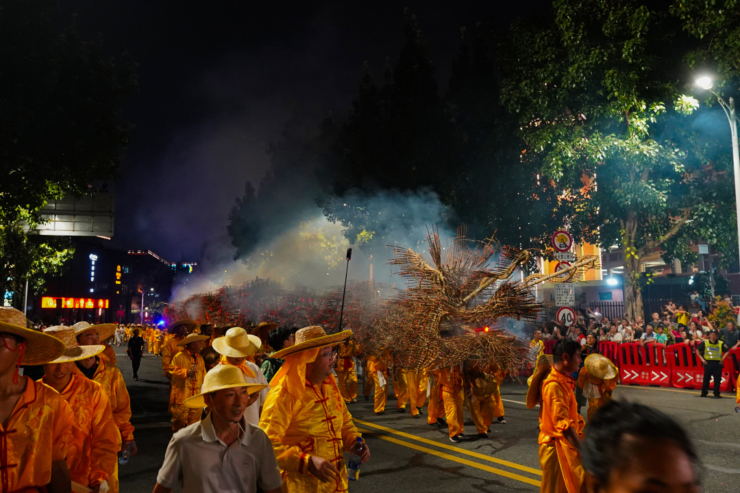 在众多精彩展演中,来自湖南汝城的国家级非物质文化遗产——“汝城香火龙”成为当晚最引人瞩目的焦点。这条长达53.8米的香火龙,以稻草扎骨,周身插满6万余支香火。夜色中,香火闪烁、红光流转,巨龙宛如“火焰精灵”穿梭于街巷之间,既彰显“国泰民安”的传统寓意,也与佛山秋色“庆丰收、乐升平”的主题高度契合,为巡游增添了浓厚的跨省非遗交流色彩。