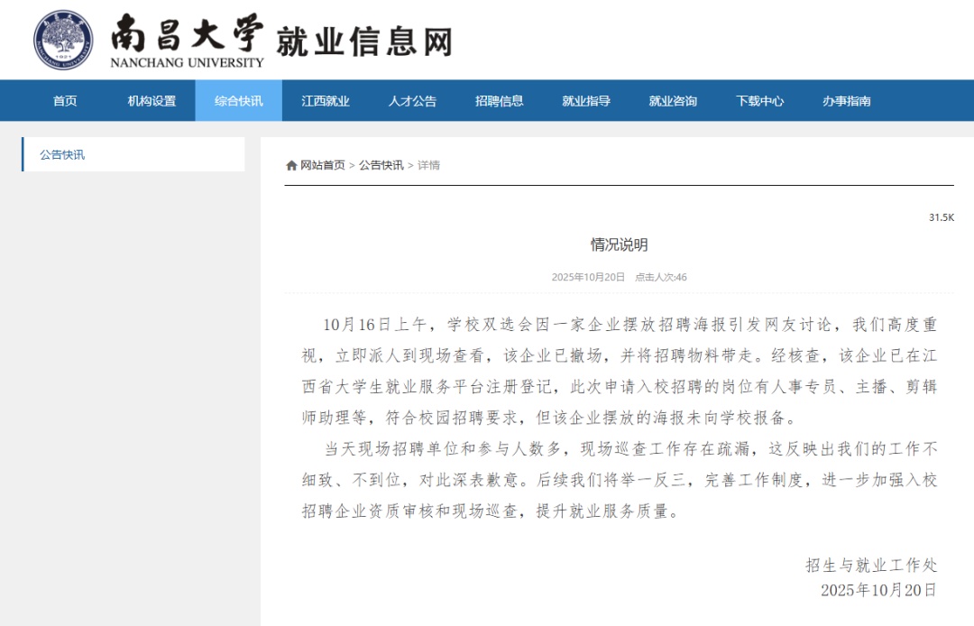 10月20日,南昌大学招生与就业工作处发布《情况说明》,全文如下: