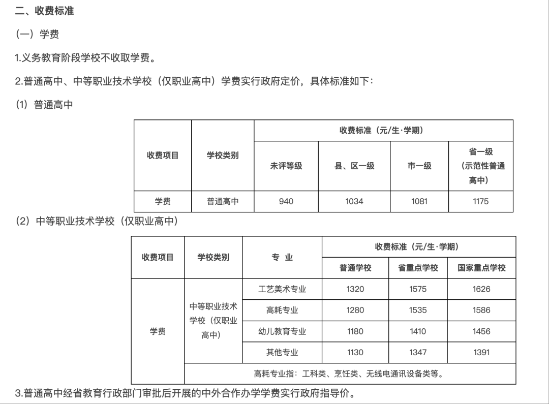 普通高中、中等职业技术学校(仅职业高中)学费实行政府定价,其中普通高中的具体学费标准为:未评等级的普通高中学费为940元/生·学期;县、区一级普通高中学费为1034元/生·学期;市一级普通高中学费为1081元/生·学期;省一级(示范性普通高中)普通高中学费为1175元/生·学期。